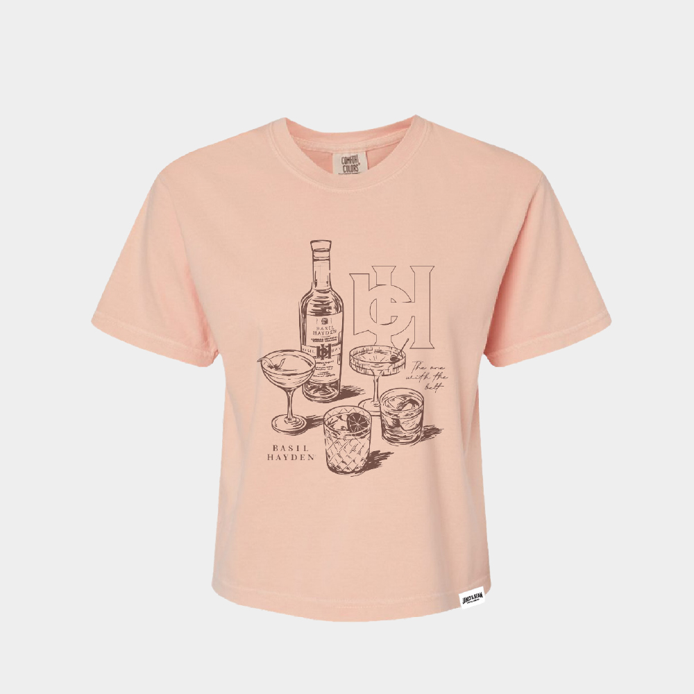 A soft, laid‑back tee with an artsy twist. This cropped style features a hand‑sketched cocktail illustration paired with a subtle nod to a refined bourbon favorite. Easygoing, lightweight, and perfect for anyone who likes their casual outfits served with a touch of class.