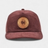 This high profile, brown corduroy hat features a round woven patch with the Basil Hayden logo. Brown leather with brass clasp closure.